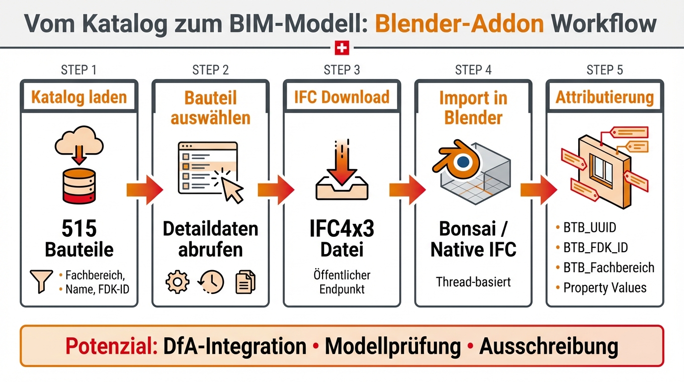 Wir haben ein Blender-Addon entwickelt, das den BTB-Katalog direkt in den Blender-Workflow integriert. Das Addon ist als Python-Skript umgesetzt und nutzt die oben beschriebenen, aus der Webapplikation abgeleiteten Endpunkte.
