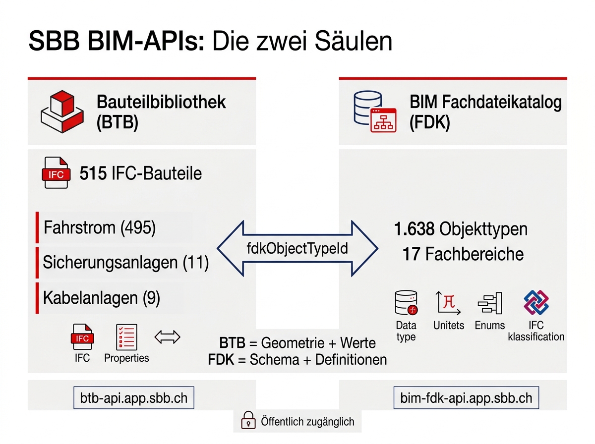 Sowohl die SBB als auch die Stadt Zürich betreiben öffentlich zugängliche BIM-Objektdatenbanken: die Bauteilbibliothek (BTB) mit dem zugehörigen BIM Fachdatenkatalog (FDK) bei der SBB, sowie «Der Baukasten» bei der Stadt Zürich. Keine der beiden Plattformen dokumentiert ihre Schnittstellen offiziell. Die hier beschriebenen API-Endpunkte haben wir durch Analyse der jeweiligen Webapplikationen rekonstruiert.