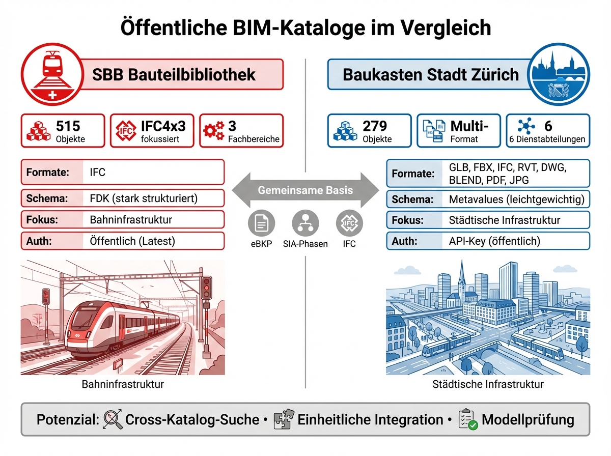 Öffentliche BIM-Objektdatenbanken sind kein Alleinstellungsmerkmal der SBB. Die Stadt Zürich betreibt mit «Der Baukasten» (baukasten.stadt-zuerich.ch) eine vergleichbare Plattform, mit einem anderen Fokus, aber derselben Grundidee.